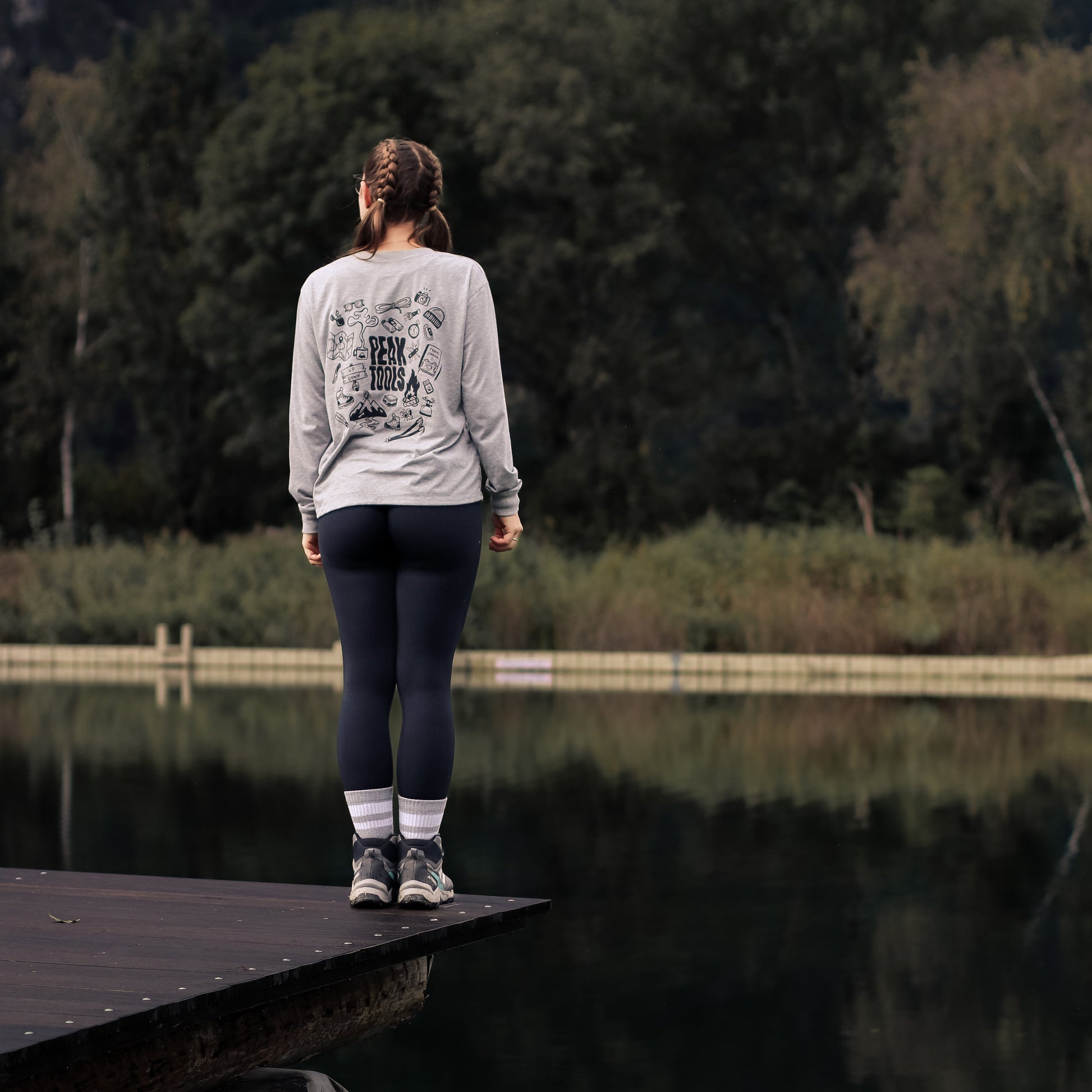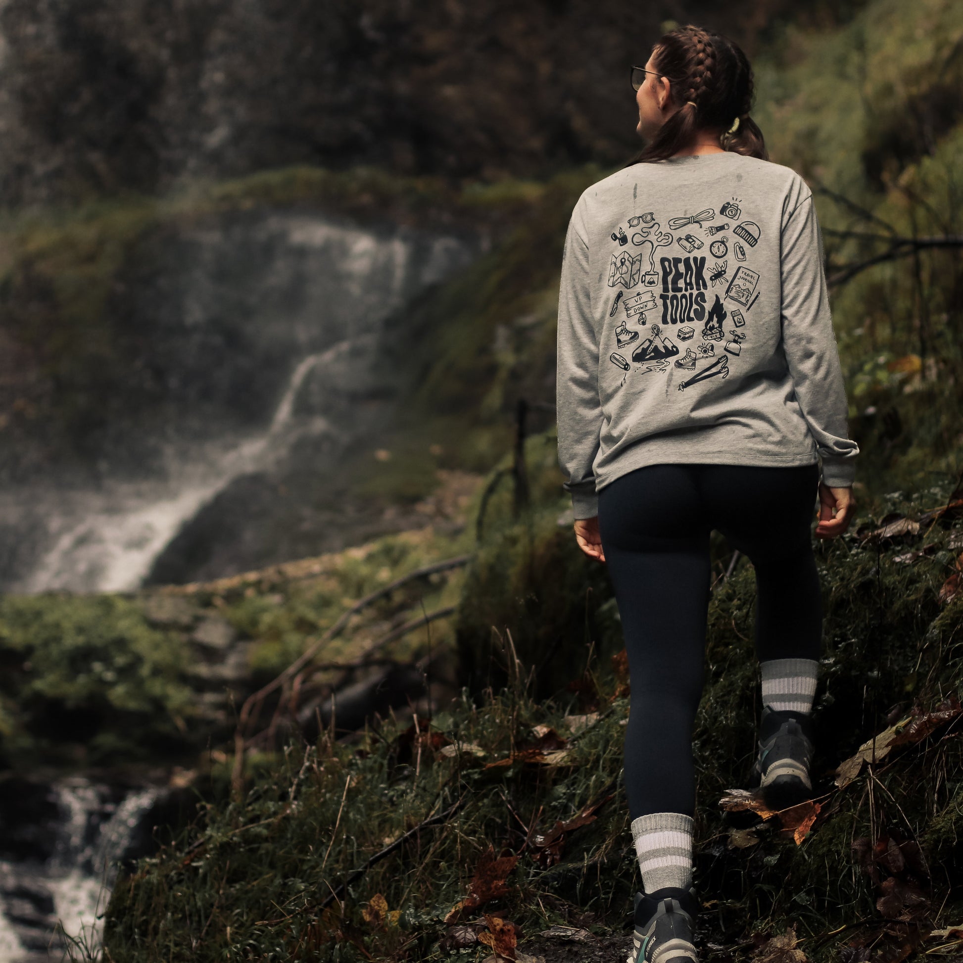✨ Hinten: Viele kleine Symbole von allem, was man fürs Berggehen braucht – von Bergschuhen bis Seil. Alles vereint in einem Design, das dich sofort ins Abenteuer zieht.